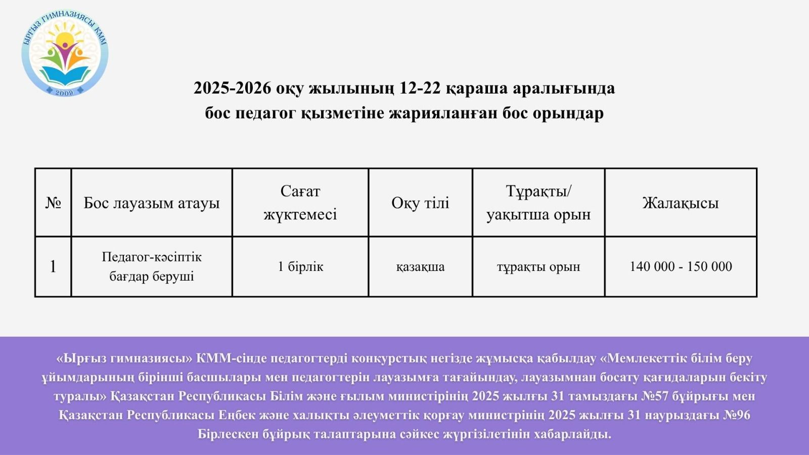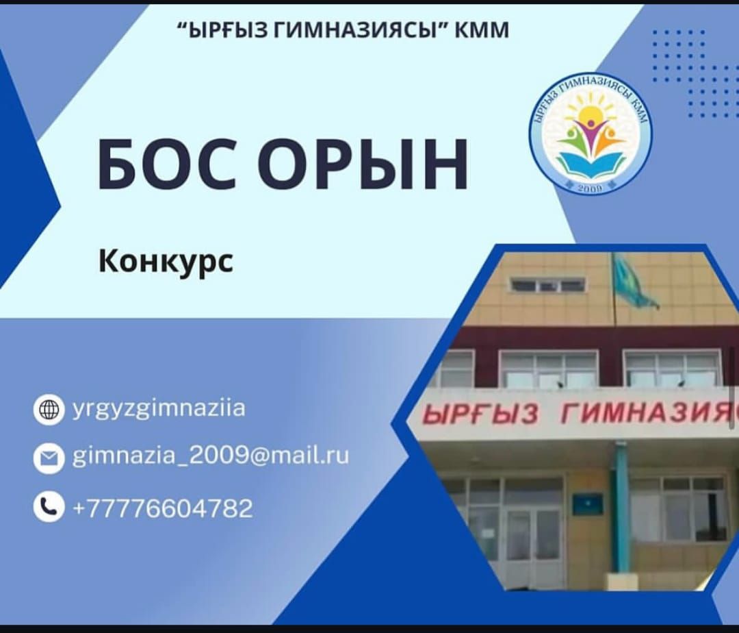 Мектепке қажетті бос лауазымдар туралы ақпаратты жұмыспен қамту орталығының «enbek.kz» сайтынан, мектептің инстаграм «yrgyzqimnaziia» парақшасынан көруге болады.